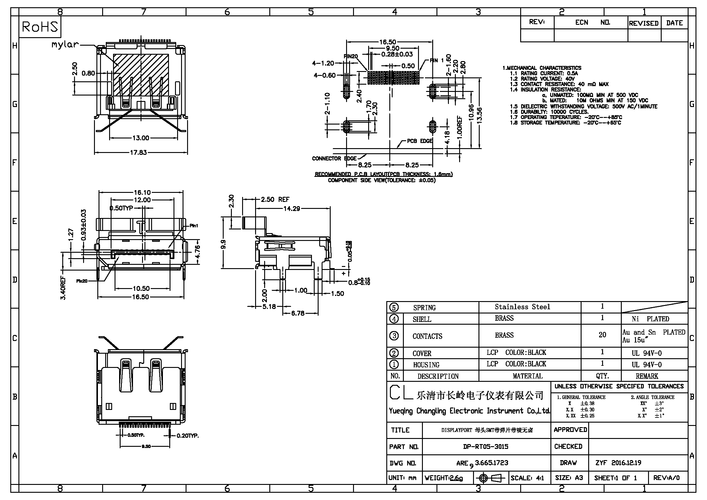 DP receptacle 20pin Top-mount W/Flange (H=12.78mm) Shell:4legs DIP type. Terminal 20P SMT type